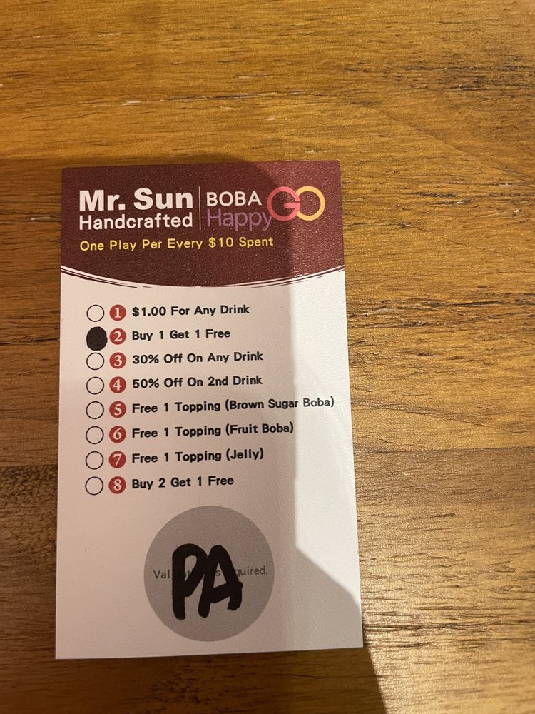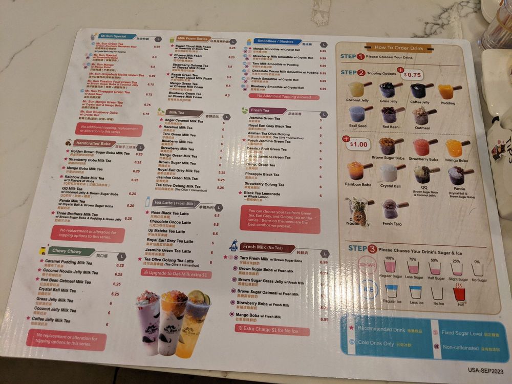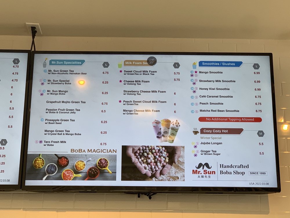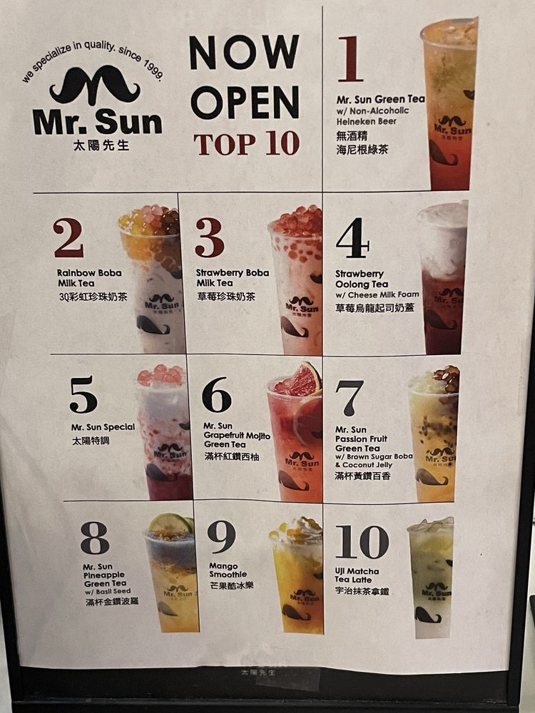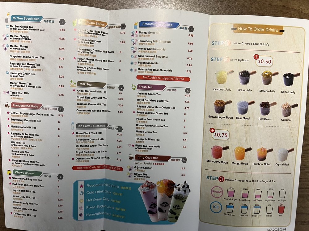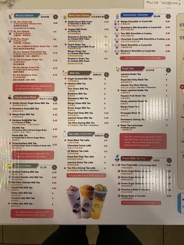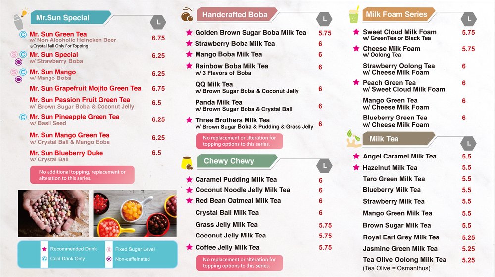 - Unique Mr. Sun Specials: Try the Mr. Sun Mango with Mango Boba or the refreshing Mr. Sun Special, which replicates the taste of strawberry ice cream.